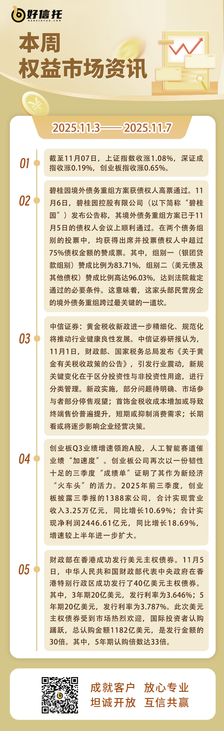 1、投资者看好中国经济,40亿美元主权债券被超额认购 。中华人民共和国财政部代表中央政府11月5日在香港特别行政区成功发行了40亿美元主权债券。其中,3年期20亿美元,发行利率为3.646%;5年期20亿美元,发行利率为3.787%。此次美元主权债券受到市场热烈欢迎,国际投资者认购踊跃,总认购金额1182亿美元,是发行金额的30倍。其中,5年期认购倍数达33倍。 此次美元主权债券投资者类型丰富,地域分布广泛。亚洲、欧洲、中东、美国投资者分别占比53%、25%、16%、6%,主权类、银行和保险、基金资管、交易商等类型投资者分别占比42%、24%、32%、2%。此次发行的债券将全部在香港联合交易所上市。