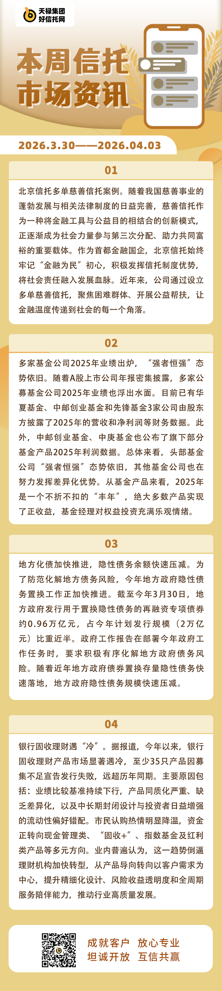 1、债券市场功能持续有效发挥。在3月31日ICMA中国债务资本市场2026年度会议上,中国证监会债券监管司副司长黄建山在会议上表示,债券市场功能持续有效发挥,特别是中长期信用债规模占全市场的七成左右,交易所市场已成为实体企业直接融资,中长期融资和资本形成的重要渠道。债券市场产品与服务体系丰富齐全。交易所市场已形成涵盖国债,地方政府债,金融机构债,公司债,企业债等大类品种的市场体系。推出科创债,绿色债,乡村振兴债,中小微企业债,熊猫债,“一带一路”债等10多个专项债产品,累计融资超3万亿元,以市场化方式引导资金流向实体经济关键领域和薄弱环节。